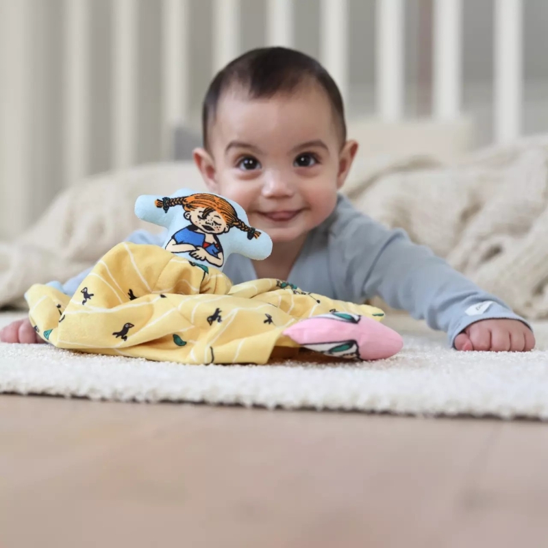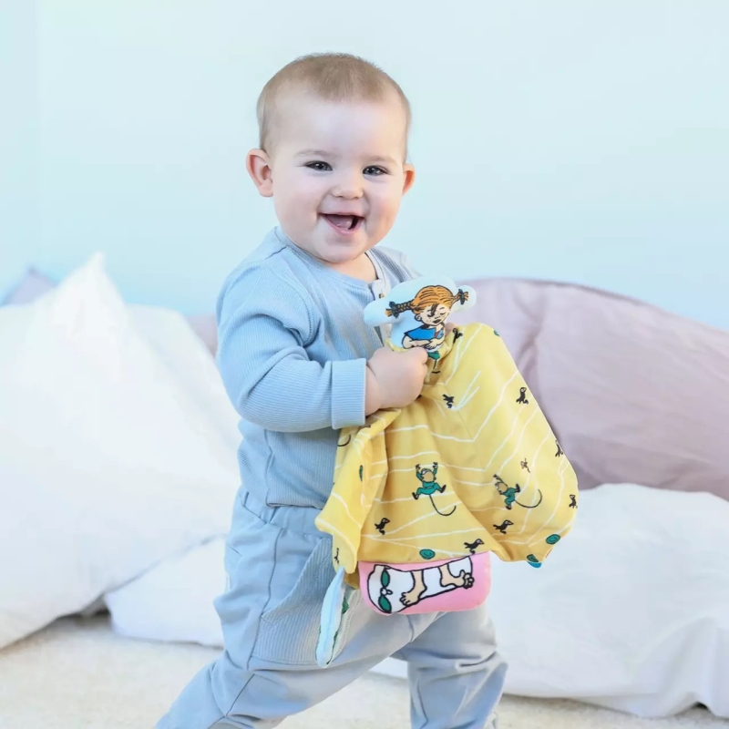 Hier slaapt Pippi natuurlijk met haar voeten op het kussen! Een superzacht knuffeldekentje dat snel favoriet wordt bij de allerkleinsten. Met een kleurrijke illustratie en kleine leuke lintjes om aan te raken, is het dekentje een must-have voor de kleintjes. Het dekentje is 45x45 cm en past perfect in de kinderwagen, het bed of in de armen, en is gemakkelijk overal mee naartoe te nemen. Een gezellig babyspeeltje om vast te houden, mee te rusten en elke dag mee te spelen.