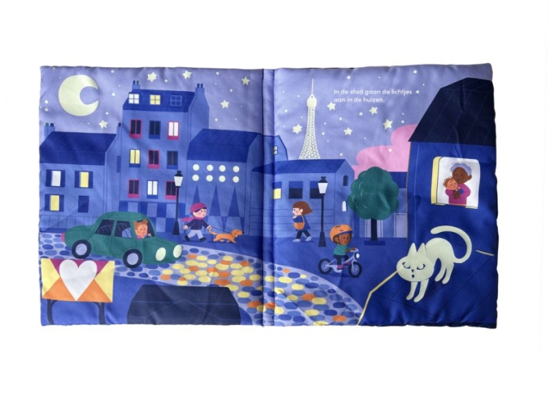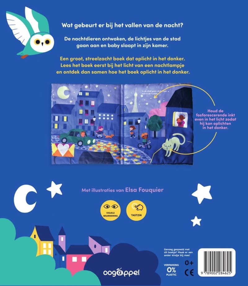 Wat gebeurt er bij het vallen van de nacht? De nachtdieren ontwaken, de lichtjes van de stad gaan aan en baby slaapt in zijn kamer. Een groot, streelzacht boek dat oplicht in het donker.Lees het boek eerst bij het licht van een nachtlampje en ontdek dan samen hoe het boek oplicht in het donker.