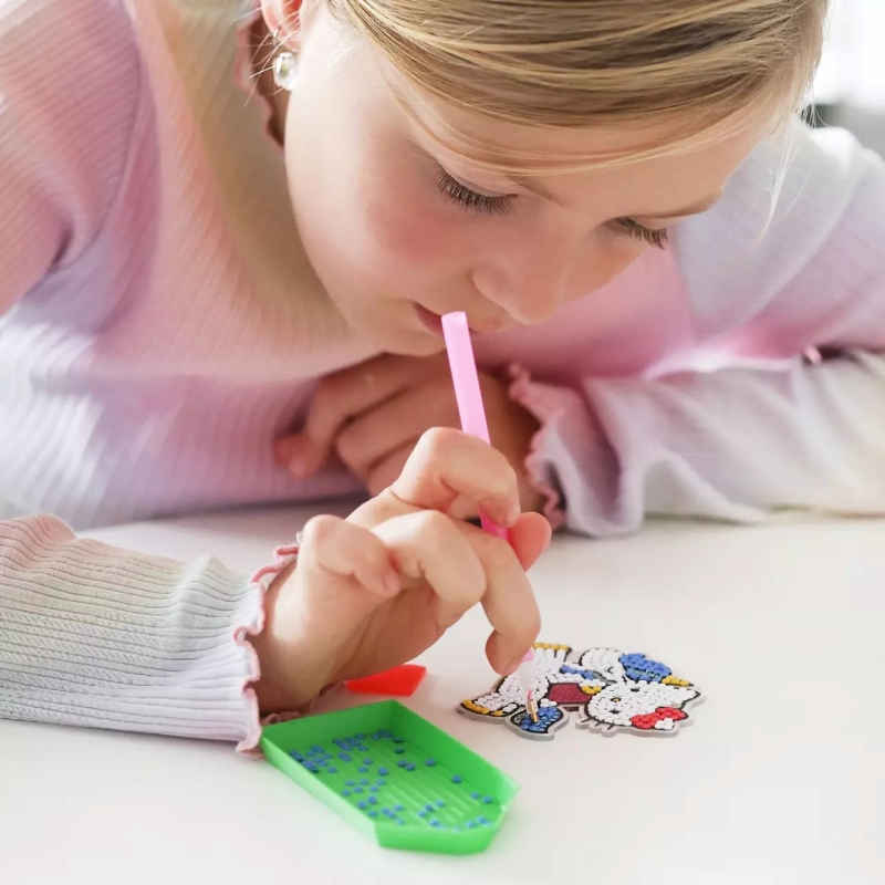 Geef je sleutelhanger of tas een sprankelende touch met deze Hello Kitty diamond painting! Met deze creatieve set kunnen kinderen hun eigen sleutelhanger maken door 350 kleine diamantjes op het plaatje te plakken. Volg de nummers, pak de juiste kleur met de pen en plaats de diamantjes op de juiste plek. Stap voor stap verschijnt er een sprankelend Hello Kitty-ontwerp!